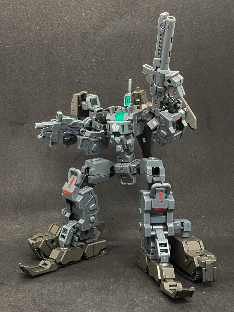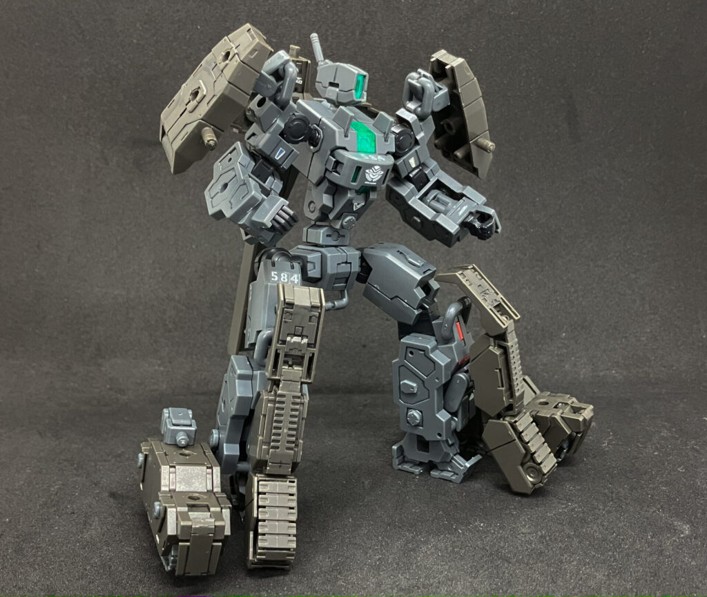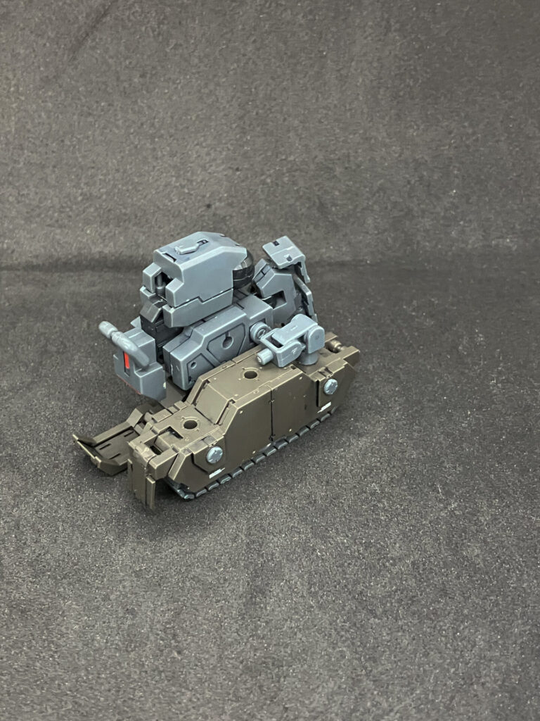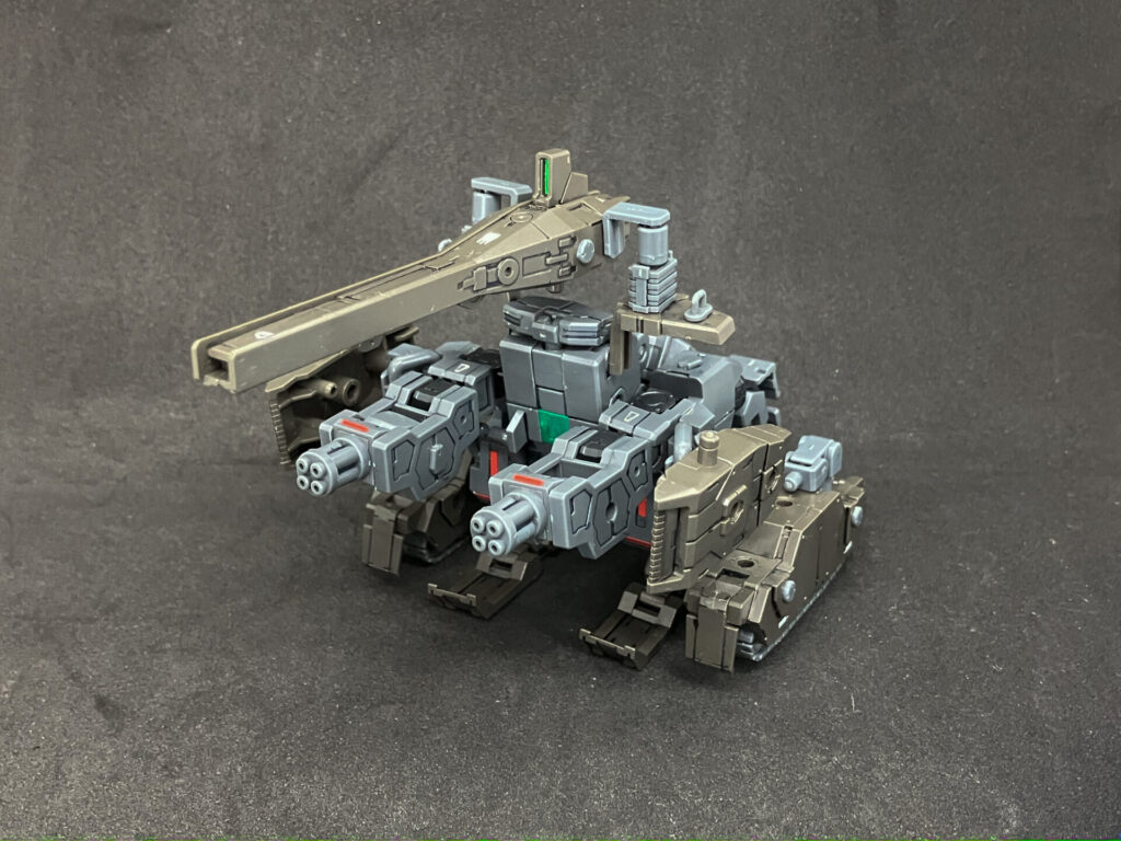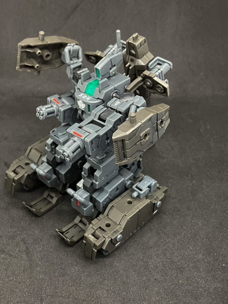 エグザビークル(可変戦車)完成しました! 小型可変機+タンクver(オリーブドラブ)を組み合わせ、本体の3形態+タンクのパーツ追加による5形態を追加して合計8形態を楽しめる、