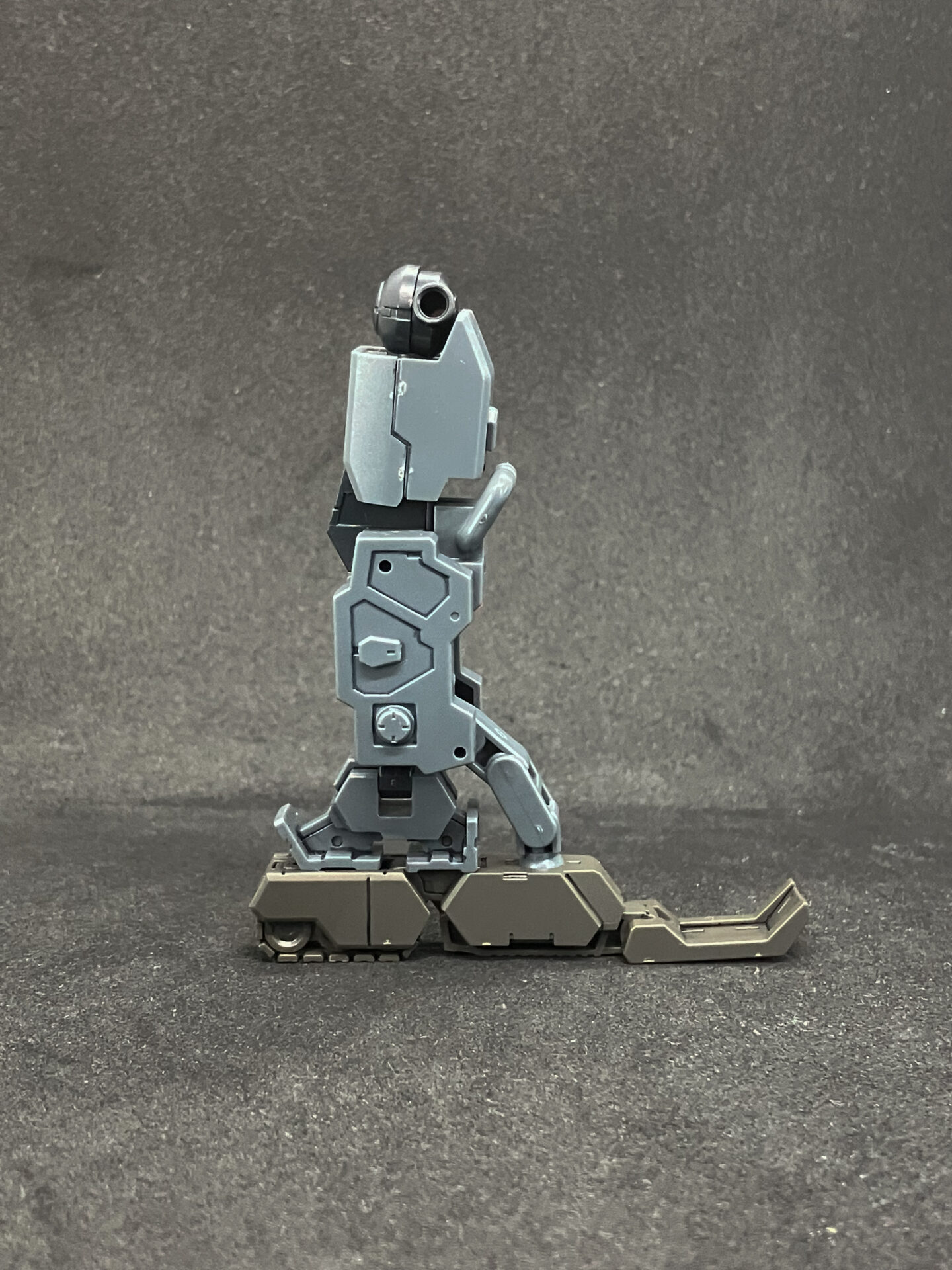 本体の足首を180°回してスネ正面の履帯を下ろし、水平になるように乗せて接地。