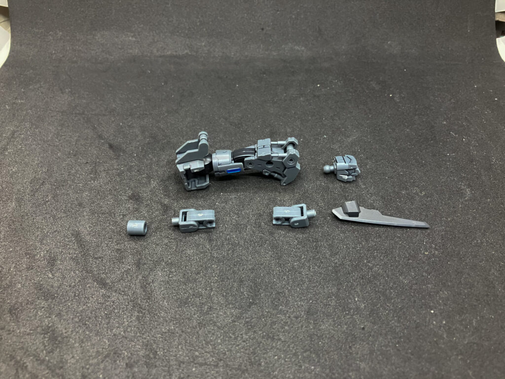小型量産機の脚が腕フレームの構造で作られているので腕に転用。ここにも展開式ダガーを装備しています。