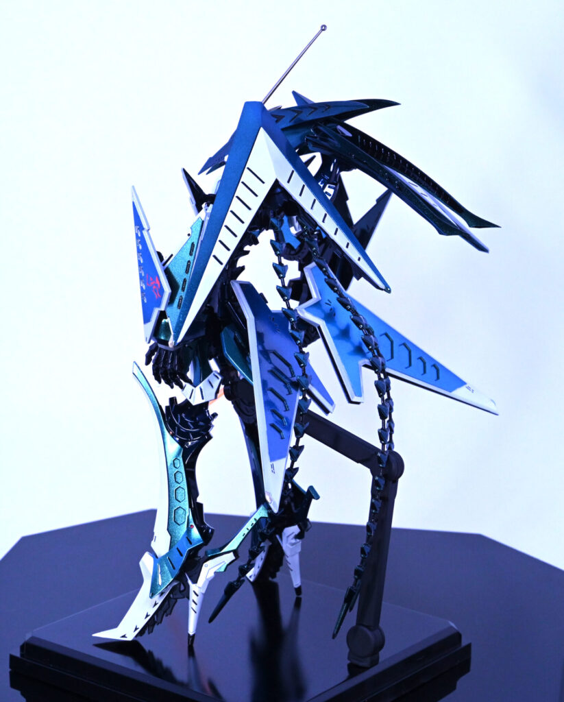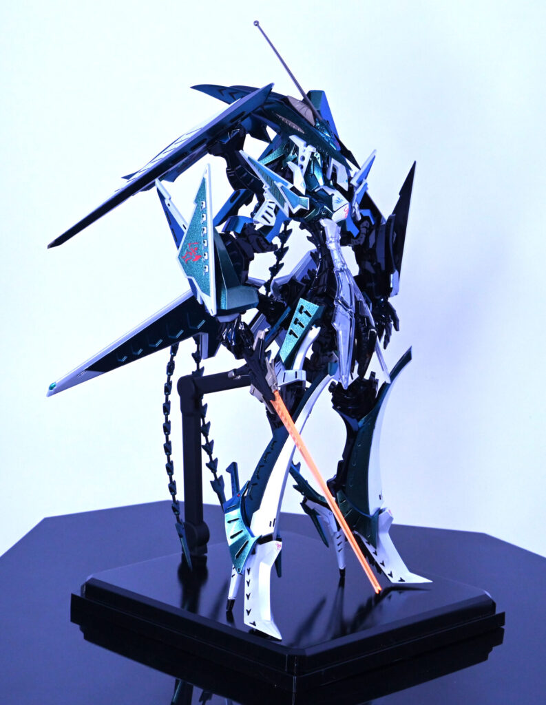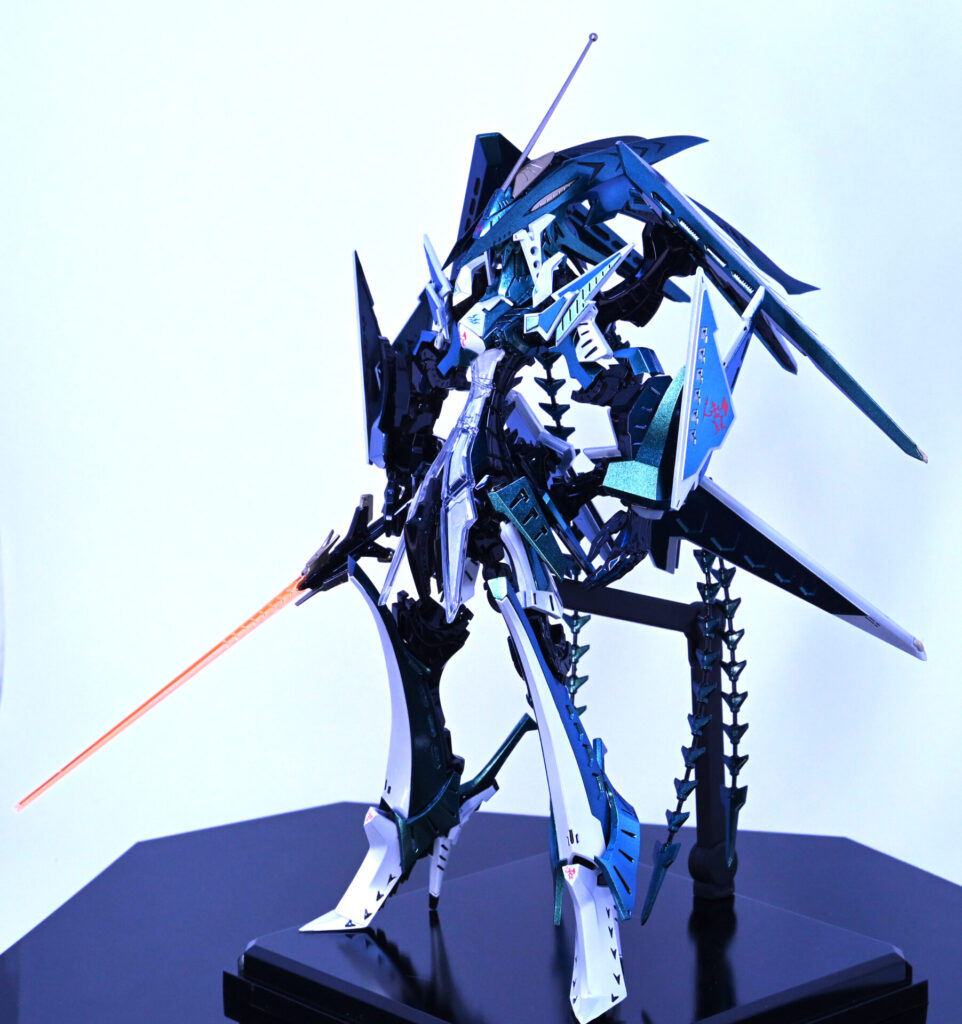 人気機体だけあってスカイブルーで塗装された完成品をよく見かけますが、この作品はあえてメタリックグリーン~青へと変化する偏光パール塗装で仕上げています