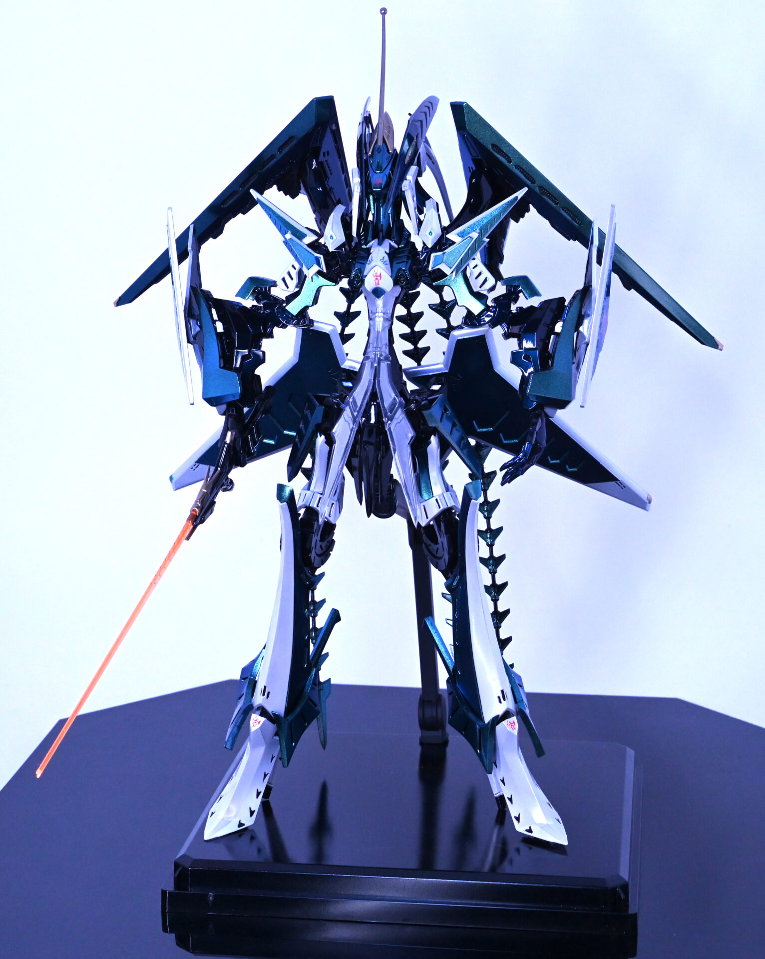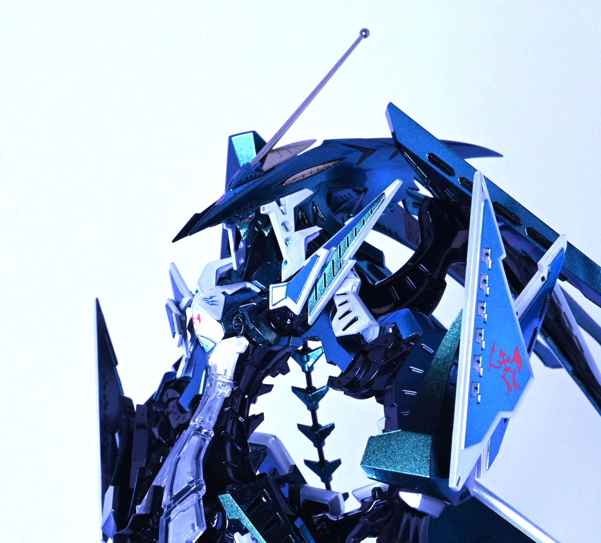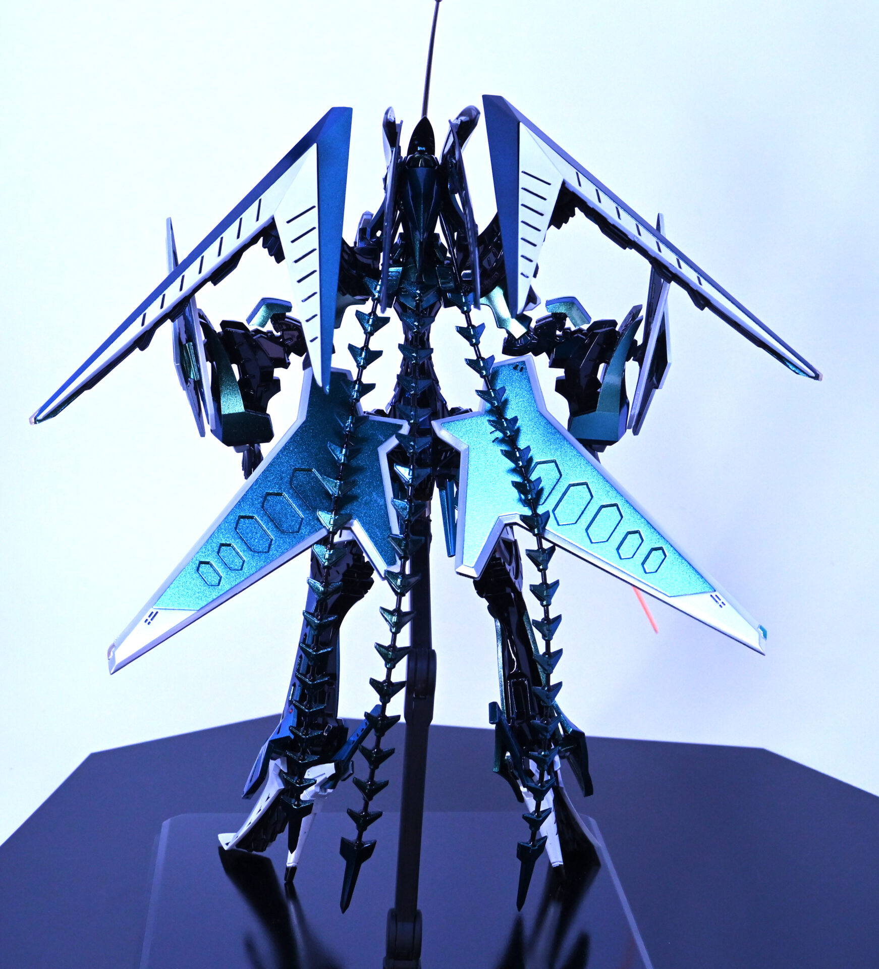 人気機体だけあってスカイブルーで塗装された完成品をよく見かけますが、この作品はあえてメタリックグリーン~青へと変化する偏光パール塗装で仕上げています