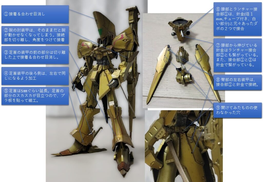 ここがこのキットの最大の難所。腰部上部品と接合部①の2点で接着する前提となっているようだが、現実的には接着面が少なすぎて難しい。左右1つずつ針金を支えとして入れ、脱着式とした。結局使わなかった穴を左右で2つずつ開けてしまったが塞げばよかった。